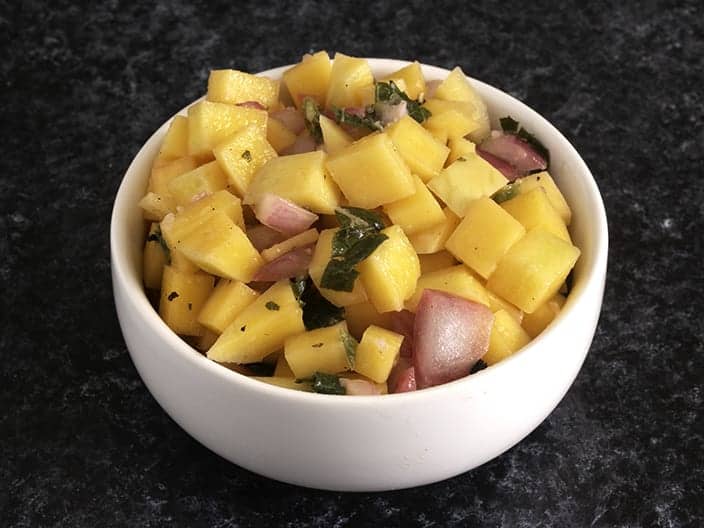 The raw taste mellows when the mangoes have had a little time to absorb the lemon dressing and you get a complex flavor from the mint, onions and mangoes and a satisfying crunch.