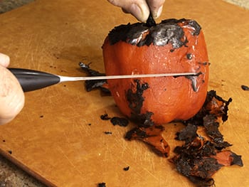Peel pepper by scraping charred skin with a sharp knife and remove all the charred bits.