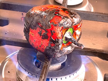 Using tongs, charr the pepper for about 5 minutes turning frequently to even the charring.