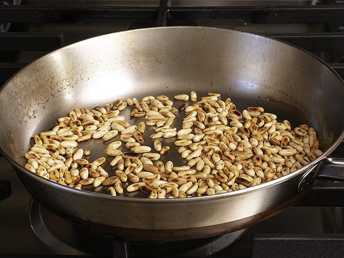 Mix in the pine nuts (keep a little for garnish) and set aside in a bowl.